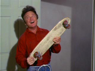 on a skateboard, careens through set wall, and breaks his big toe.