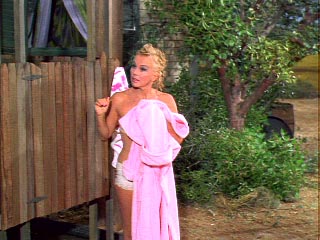 A sexy, scantily clad Lisa emerges from the outdoor shower